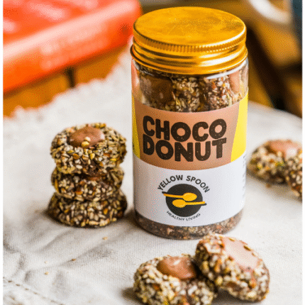 Experience pure indulgence with Yellow Spoon’s Choco Donut | Caramel Almond — a wholesome treat that blends the nutty crunch of almonds, the buttery sweetness of caramel, nutrient-rich millets, and decadent dark chocolate. Crafted without baking and free from preservatives, each donut is packed with natural goodness, making it the perfect anytime snack. Whether you’re satisfying a sweet craving or looking for a smarter snacking choice, these donuts deliver taste, texture, and nutrition in every bite