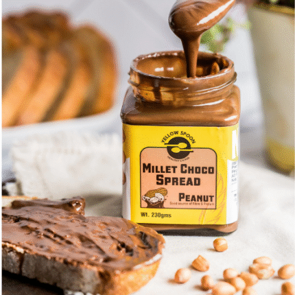 Yellow Spoon’s Millet Choco Spread | Hazelnut is where wholesome meets indulgent. Crafted from roasted hazelnuts, nutrient-packed finger millet, and rich cocoa, this silky spread is naturally sweetened and completely free from palm oil or artificial additives. Whether you slather it on toast, swirl it into pancakes, layer it on parathas, or sneak a spoonful straight from the jar, every bite delivers a delicious blend of nutrition and indulgence. With its creamy texture and nutty aroma, it’s a pantry must-have for health-conscious chocolate lovers